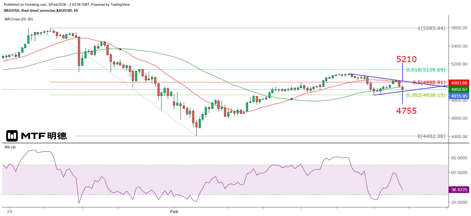 昨天金價升近5100美元受阻,且在大部分時間呈大圓頂形態,較差的ADP就業數據僅令金價輕微反彈,惟未能突破5092.31美元的高位,其後反覆下跌,最終創即市新低至4855美元後才逐步回升。今早高見5023.81美元後再度下跌,並曾跌穿4900美元,低見4896.2美元。從小時圖觀察,金價近日的累積反彈幅度超過了早前最大跌幅的50%,但未達到61.8%即回落,昨天以來的走勢呈收窄三角形,預示金價處於整固待變階段,升破5023.81美元或跌穿4855美元將視為突破,向上突破的量度目標為5210美元,向下突破的量度目標則為4755美元,以目前的走勢來看,向下突破的機會較大。