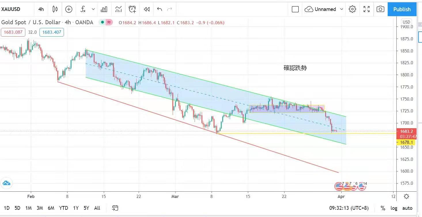 金價走勢上仍受制於下降壓力綫,週一跌穿橫行兩星期的箱底的1720美元後確認跌勢,昨日曾下試本月低位。