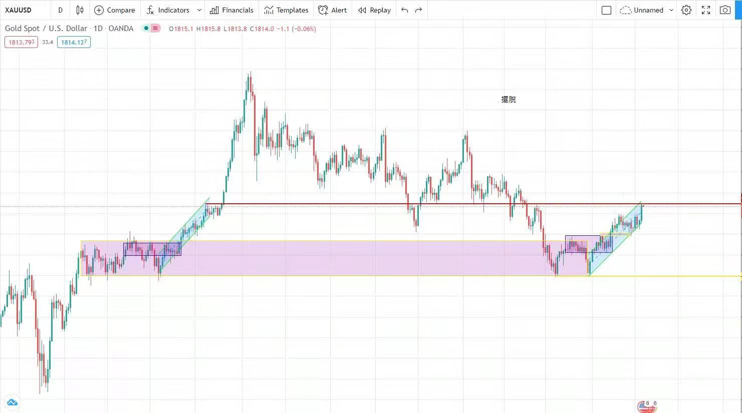 想不到三日就先過一關,到昨日所出的圖表紅綫1818美元阻力才回軟。後市只要企穩1800美元樓上,下一站1848美元。今日建議波幅在1803-1826之間。