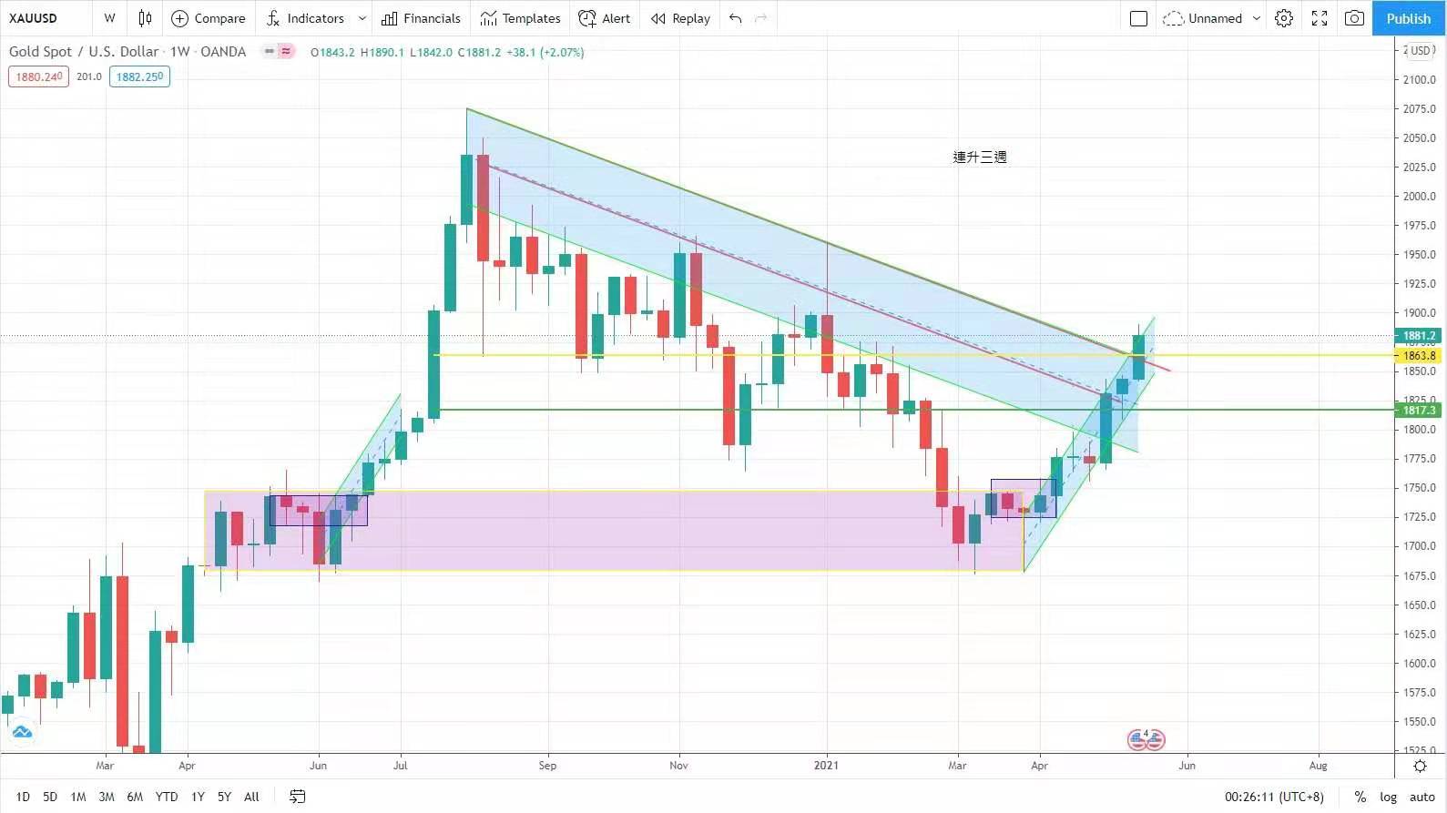 金價升穿1900美元已無懸念,只是時問題。今日建議波幅在1872-1888。
