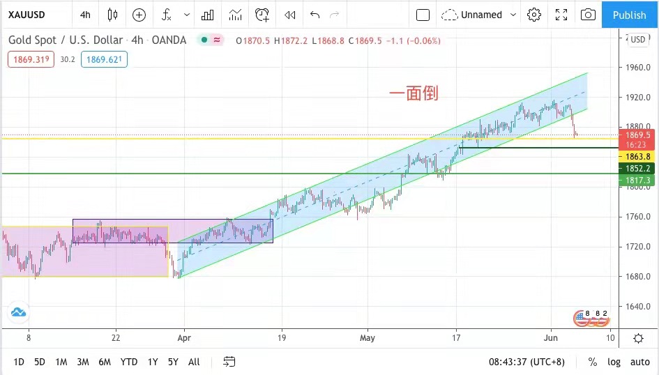 今天仍有美國非農數據,昨日走勢顯示金價在1864美元有強力支持,如今晚非農數據表現大幅優於市場預期,金價跳穿1864美元則可能