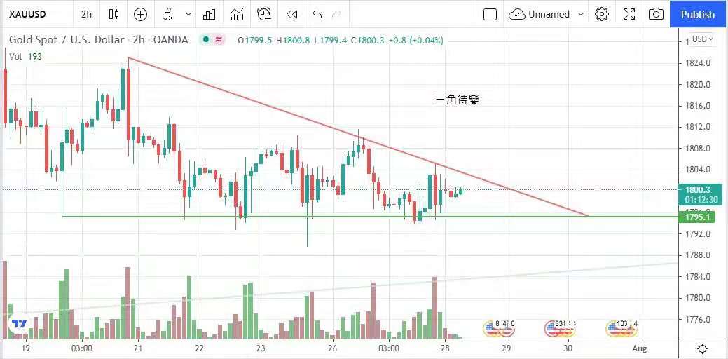 預料美聯儲繼續放鴿,今日金市在美市前應平淡過渡,但美市波幅將擴大,要注意風險管理。今日建議波幅在1795-1815之間。