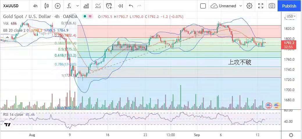 金價仍處於8月9日大調整之後的一波反彈的回調狀況,並測試黃金比率0.236及0.382的阻力與支持,昨日上攻不破,下跌亦未能穿,市場關注反映通脹的物價指數,預料金市今日繼續震盪,但短期目標1778美元不變,建議波幅在1778-1800美元之間。