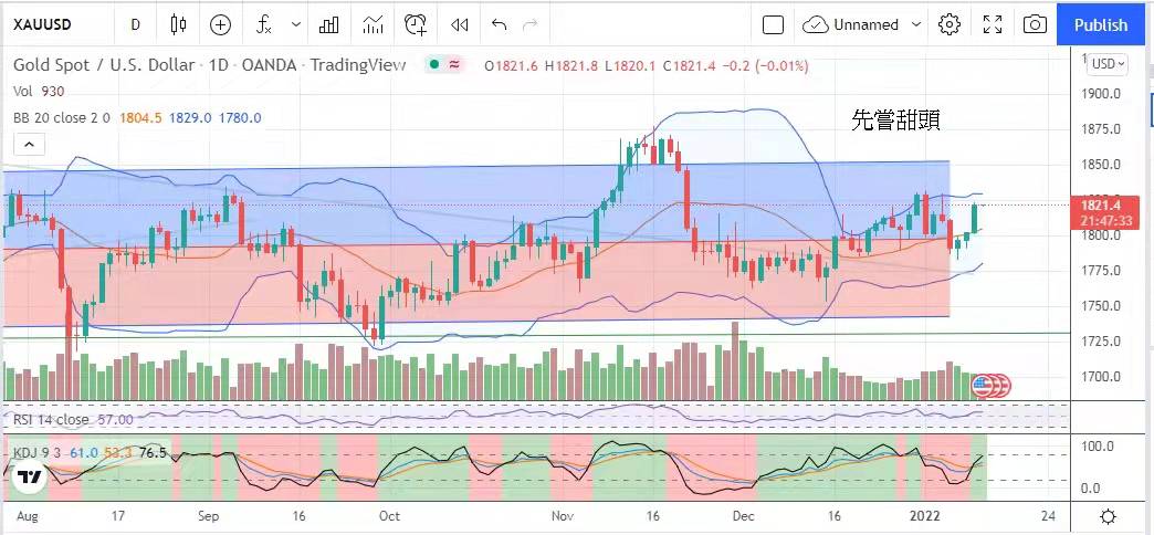 最低見1800.2,鮑威爾發言後,金價一路上升,最高見1823.4美元,以1821.6美元收市,升19.8美元。