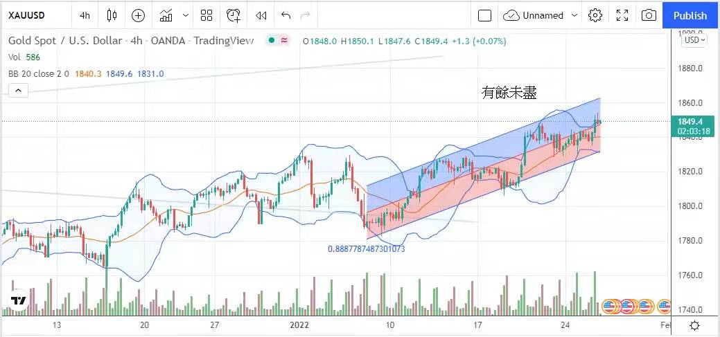 美國國防部宣布在72小時內駐軍東歐,俄羅斯則警告會作出相應升級行動。市場避險情緒進一步升溫。美聯儲將開始議息會議,並將在周四凌晨有結果,在此前仍以俄羅斯的軍事動向影響力較大。昨日金價成功挑戰上周1848美元的高位,升勢似乎有餘未盡,仍有力向上。今日建議波幅1842美元至1855美元。