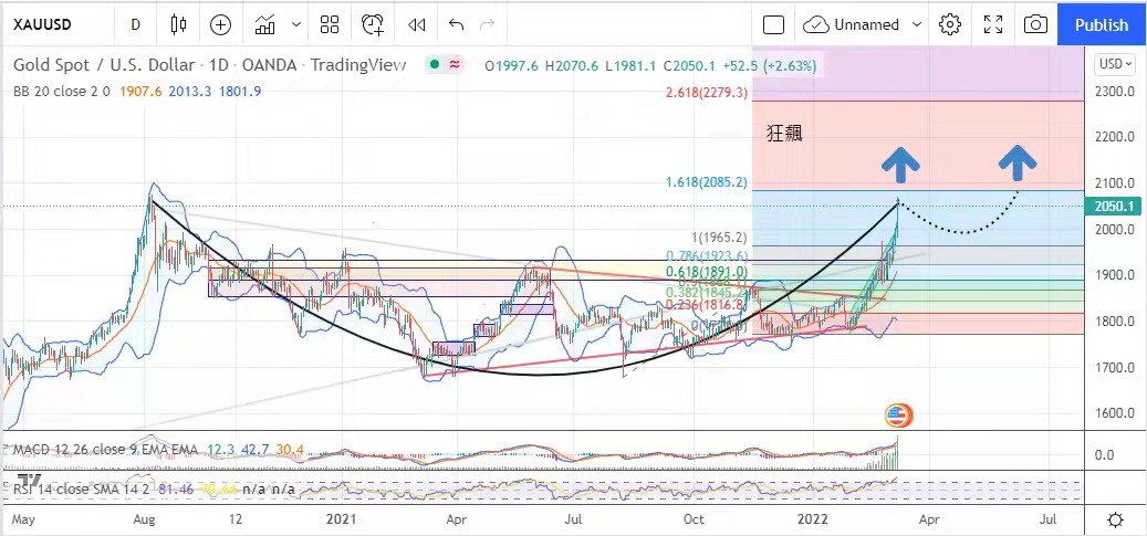 狀態。美國總統拜登正式宣布禁止入口俄羅斯石油和能源,大宗商品價格升過不停,股市下跌,金市狂飆,金價昨日最高點離歷史高位的2075.3美元
